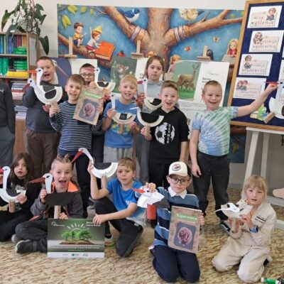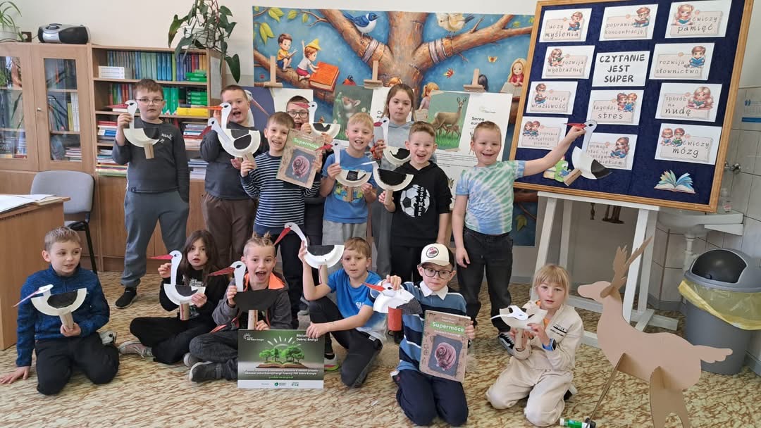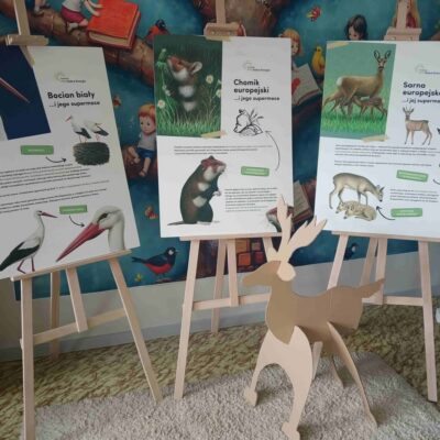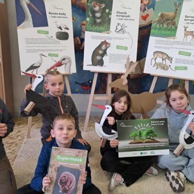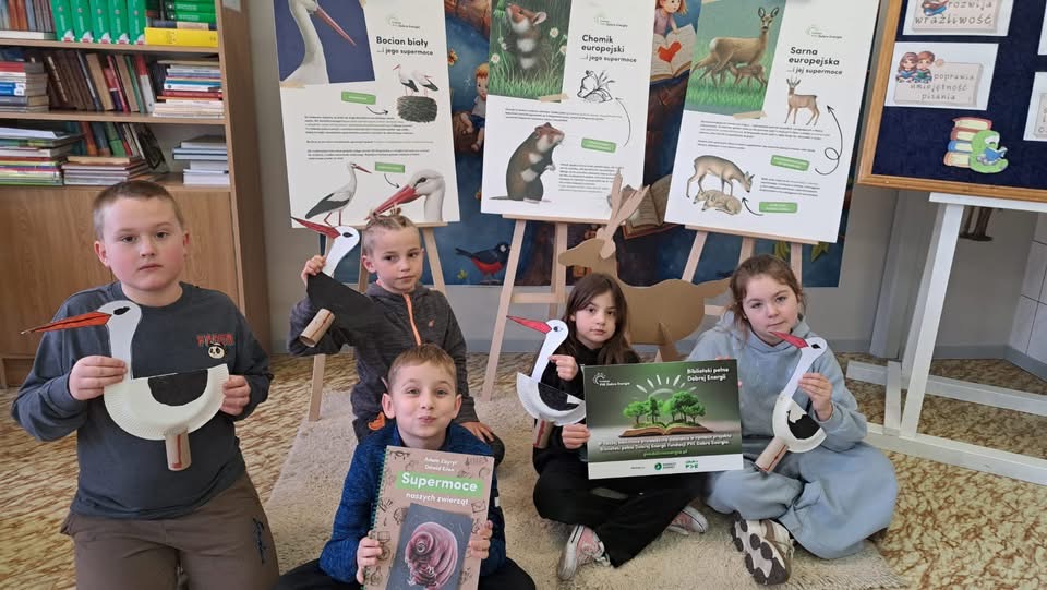 Biblioteka w szkole podstawowej im. ks. Jana Radochońskiego w Wierzbnej bierze udział w naszej akcji „Biblioteki pełne Dobrej Energii”, a dodatkowo zamówiła naszą mobilną wystawę „Supermoce naszych zwierząt”. Zainspirowani wystawą uczniowie wzięli udział w warsztatach bibliotecznych, podczas których zapoznali się z niezwykłymi zdolnościami zwierząt występujących w Polsce oraz wykonali makiety bociana białego i sarny europejskiej.